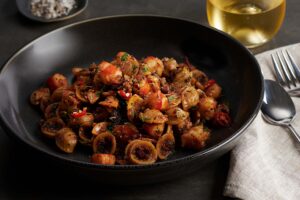 The sweetness of prawns paired with the delicious umami of black garlic and prosciutto, and the golden crunch of butter sautéed panko makes this an