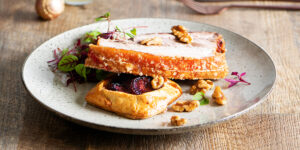 Celebrate Christmas in July with the perfect festive treat. Our roast pork belly with savoury plum tart, micro herb salad and whisky candied walnuts is