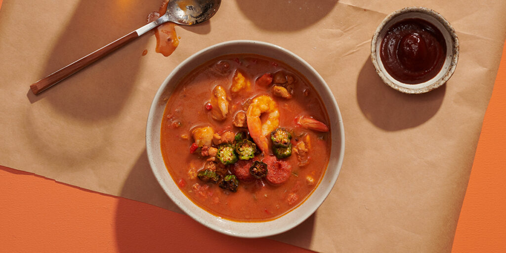 Gumbo is a hearty Creole/Cajun dish from Louisiana. Beyond that, a hard and fast definition of what makes a gumbo is elusive. Soup or stew? That depends on who is telling the story. The basic building blocks are a thickening agent (traditionally okra, later a roux- butter and flour for the Creole, and oil/lard instead of butter for the Cajun), the ‘holy trinity’ aromatic vegetable base of Creole/Cajun cuisine (onion, capsicum and celery), spices (paprika and cayenne), broth and tender pieces of fish, prawn, chicken, beef or sausage (often a combination). Sassafras is also commonly used in gumbo – it has a unique aniseed flavour (think base note of root beer). As a homage to all things Southern, we have incorporated Bull’s Eye BBQ Sauce as a tasty base note to this aromatic dish.