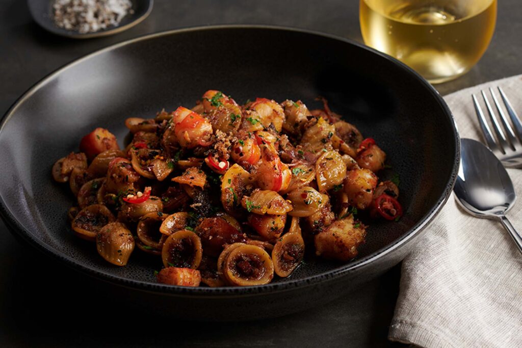 The sweetness of prawns paired with the delicious umami of black garlic and prosciutto, and the golden crunch of butter sautéed panko makes this an all-round winner on your autumn menu.