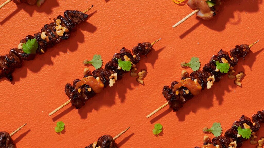 Cook the skewers over a high heat, turning regularly, basting with leftover marinade until they are cooked to your liking. Serve with dipping sauce, radishes, peanuts, coriander and lime.