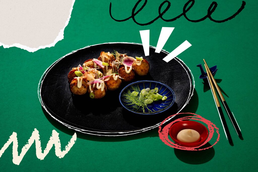 Serve with a zig zag of takoyaki sauce and kewpie mayo, and a scatter of whatever takes your fancy from the list.