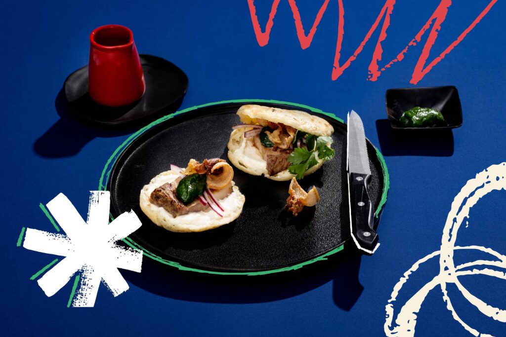Split open arepa, add pork, cilantro mojo, queso fresca and top with herbs and chicharron.