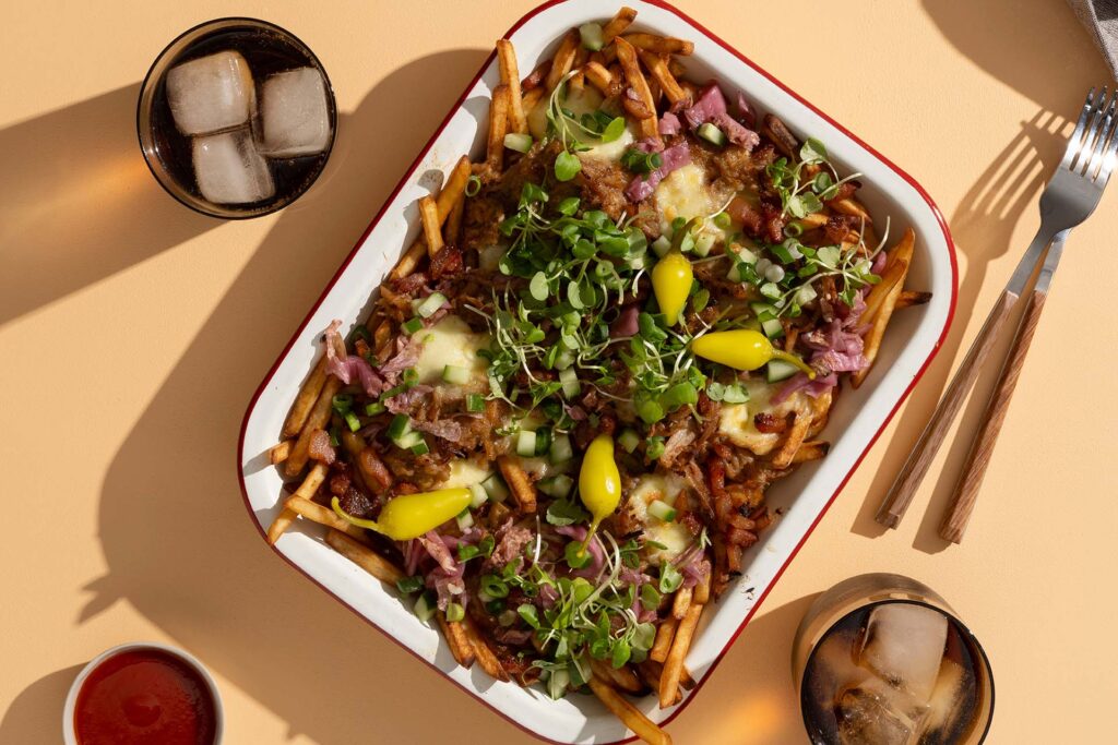 Cook the fries until golden and crisp, toss with a little salt and put into an oven proof serving dish. Arrange the pork mixture over the top of the fries, sprinkle over the crispy guanciale and dot the mozzarella pieces evenly over the top. Heat in a hot oven or salamander until the cheese melts