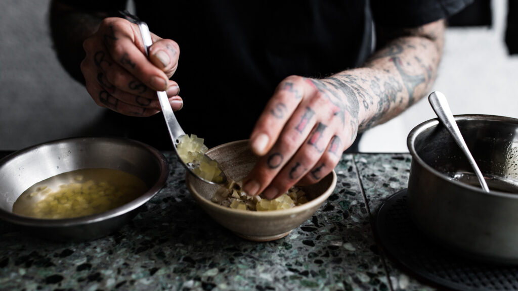I start with a product I really like to work with. From there I see where it sits in the menu and I will structure a dish around that. For example, we’re about to replace the fish dish and I have been really impressed with some organic broccoli grown by one of our chef’s parents. We BBQ the steam and fry the florets to make it like a pangrattato. We make some crisp fried onions, Thai basil and almonds seasoned with vinegar powder. This goes over the cooked harpuka that is finished with a dark fish sauce made with roasted fish bones, steeped with basil and enriched with seeded mustard. It’s a great balance of light and dark flavours. We also are very aware that with 10 courses the meal needs to be balanced so we are making dishes that have great flavour but are less rich, less dense. We reckon we get it right.