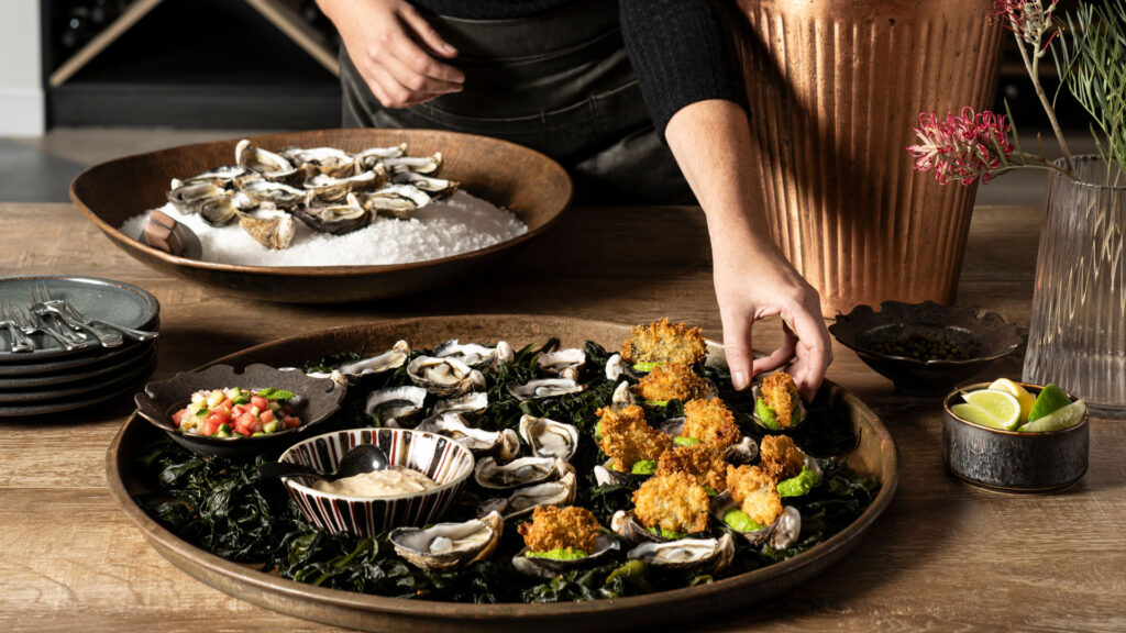 Nothing shouts celebration more than an abundant platter of oysters; an oyster bar is a perfect contender for spring gatherings – fun, luxe and delicious rolled into one. Featuring a panko crumbed with pea purée and horseradish cream and natural with watermelon chilli salsa, these recipes can easily be doubled or tripled.
