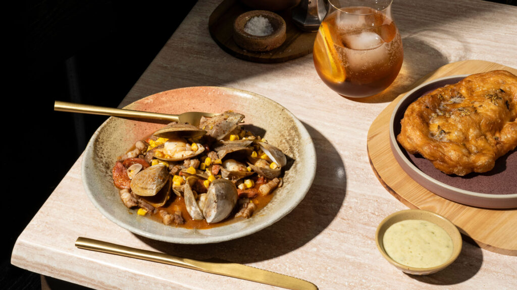 The Spanish are responsible for some of the best surf and turf options around – the winning combination of shellfish and pork is no exception. This version has loads of bright flavours you would associate with Spanish cuisine, and the green chilli aioli and fried bread might just make it perfect. Serve with a Spanish-inspired spritz.