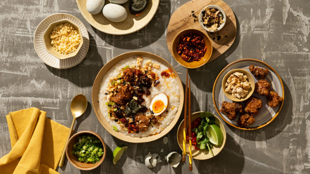 Ladle the congee into bowls, top with the eggs, chicken, shallots, crispy chilli and a drizzle of sesame oil. Serve with lime wedges, coriander and extra toppings on the side.