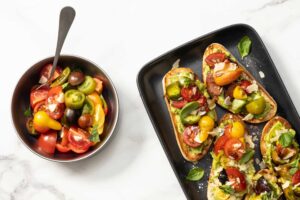 Simple, tasty and versatile. Bruschetta is a delicious menu addition, suitable for shared plates, appetisers and bar food. 10 Serves 10m Prep 30m Marinate 10m