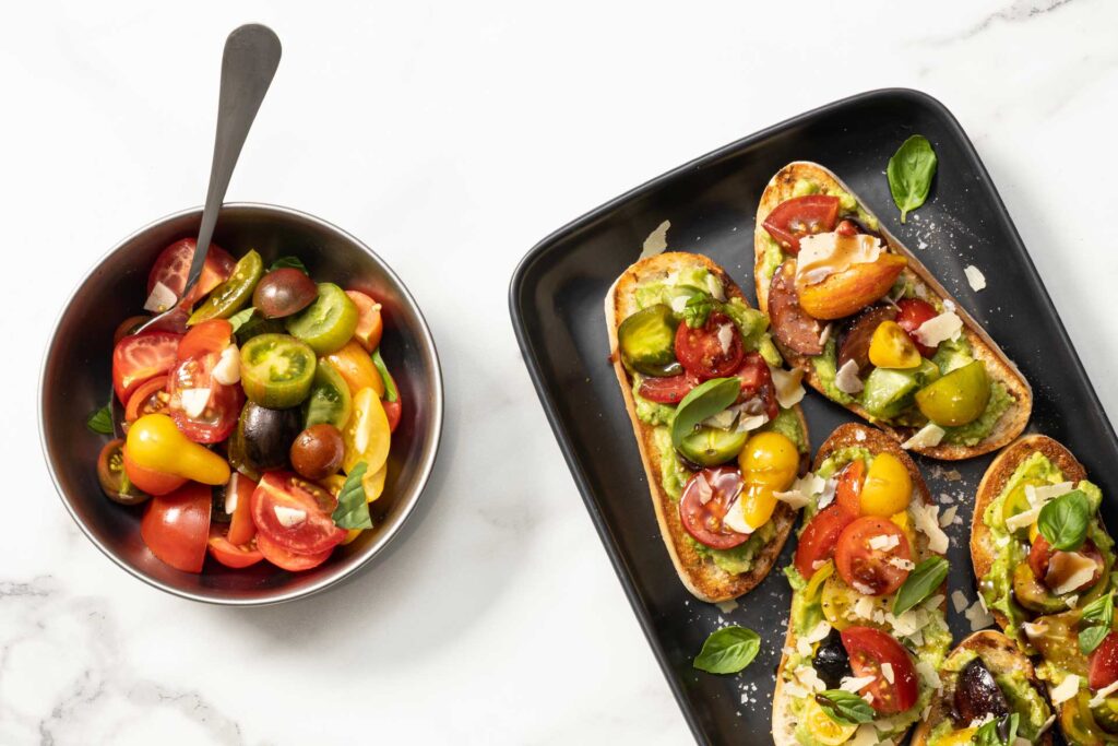 Rub the toasted bread with the garlic cloves. Spread the warm toast slices with avocado pulp (about 30g per slice) and top with the marinated tomato mix and drizzle with balsamic. Sprinkle over the shaved parmesan cheese, garnish with basil leaves and season with sea salt and freshly ground black pepper. Finish with a final drizzle of extra virgin olive oil.