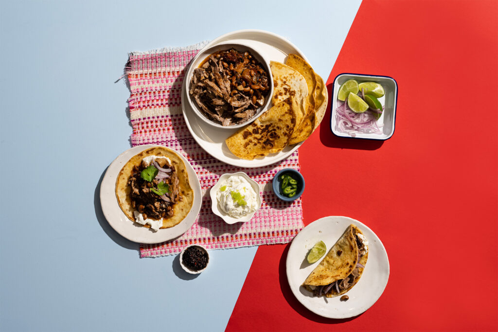 Make the tacos by spreading a spoonful of goat’s curd across the centre of the tortilla, top with the shredded mutton and some of the beans from the sauce, fresh coriander and red onion. Serve with lime wedges.