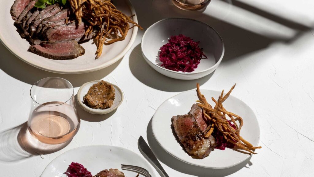 Serve steak sliced with smoky tomato butter, sauerkraut and crispy sweet potato fries.