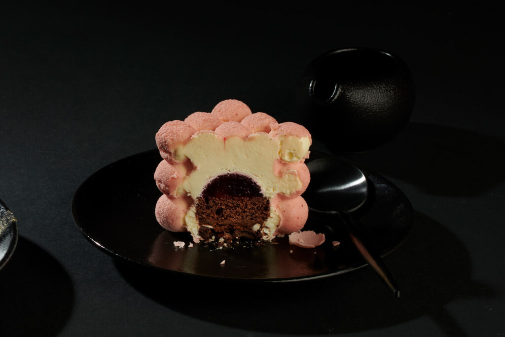 Pipe the cream cheese mousse into the moulds until about ¾ full (the size of your moulds versus the size of your inserts will dictate how high to fill the moulds), press the cake inserts into the centre, and freeze for at least 3 hours.