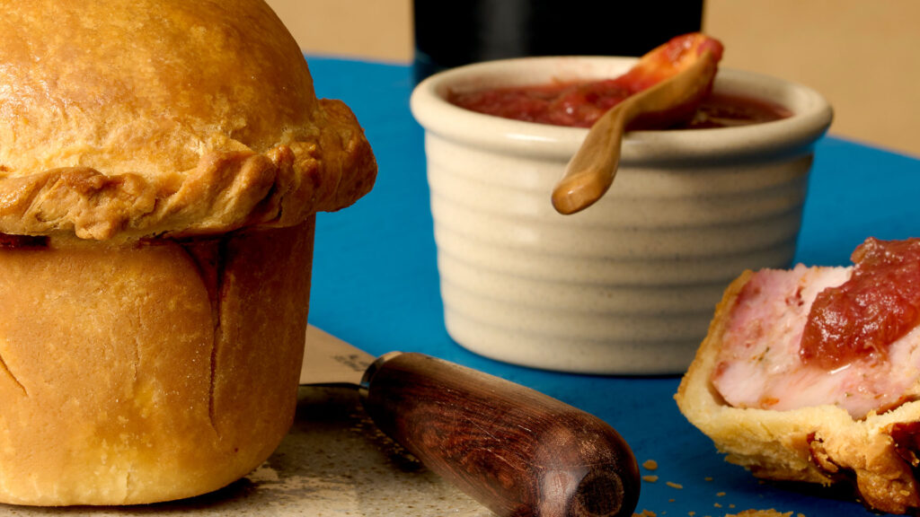 To say pork pie is quintessentially British is a grand understatement. This OG classic is the ultimate pork showcase, a thing of beauty. A rich golden pastry crust encasing a dense, pork filling flavoured with sage and nutmeg, quietly celebrating all things pork in the best of British style: practical, restrained and elegantly simple. There have been many ventures into pork pies with more, yet purists argue that the filling must be simple, just porky charm with a hint of seasoning. That any additional flavours must come from the support act, chutneys, pickles and so on. Most often served at room temperature (jellied), we have opted for a warm version, this less common spin is perfect for autumn, served with a tangy rhubarb chutney.